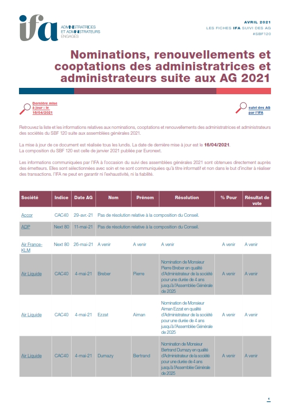 Retrouvez la liste et les informations relatives aux nominations, cooptations et renouvellements des administratrices et administrateurs des sociétés du SBF 120 suite aux assemblées générales 2021. La composition du SBF 120 est celle de janvier 2021 publiée par Euronext.